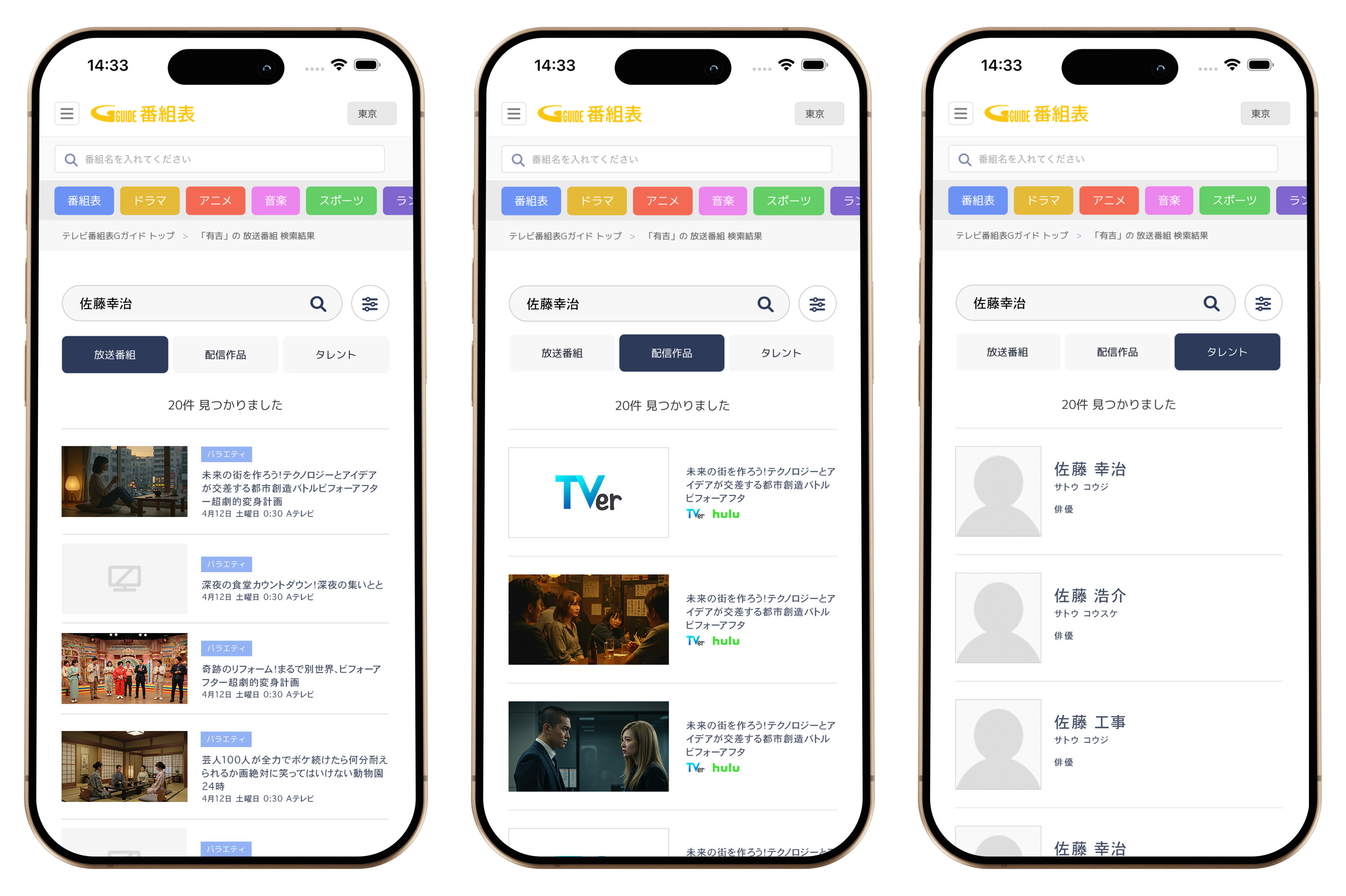 検索結果にはタレントのプロフィール情報と、関連する現在出演中の番組 or 次に出演予定の番組が表示されます。