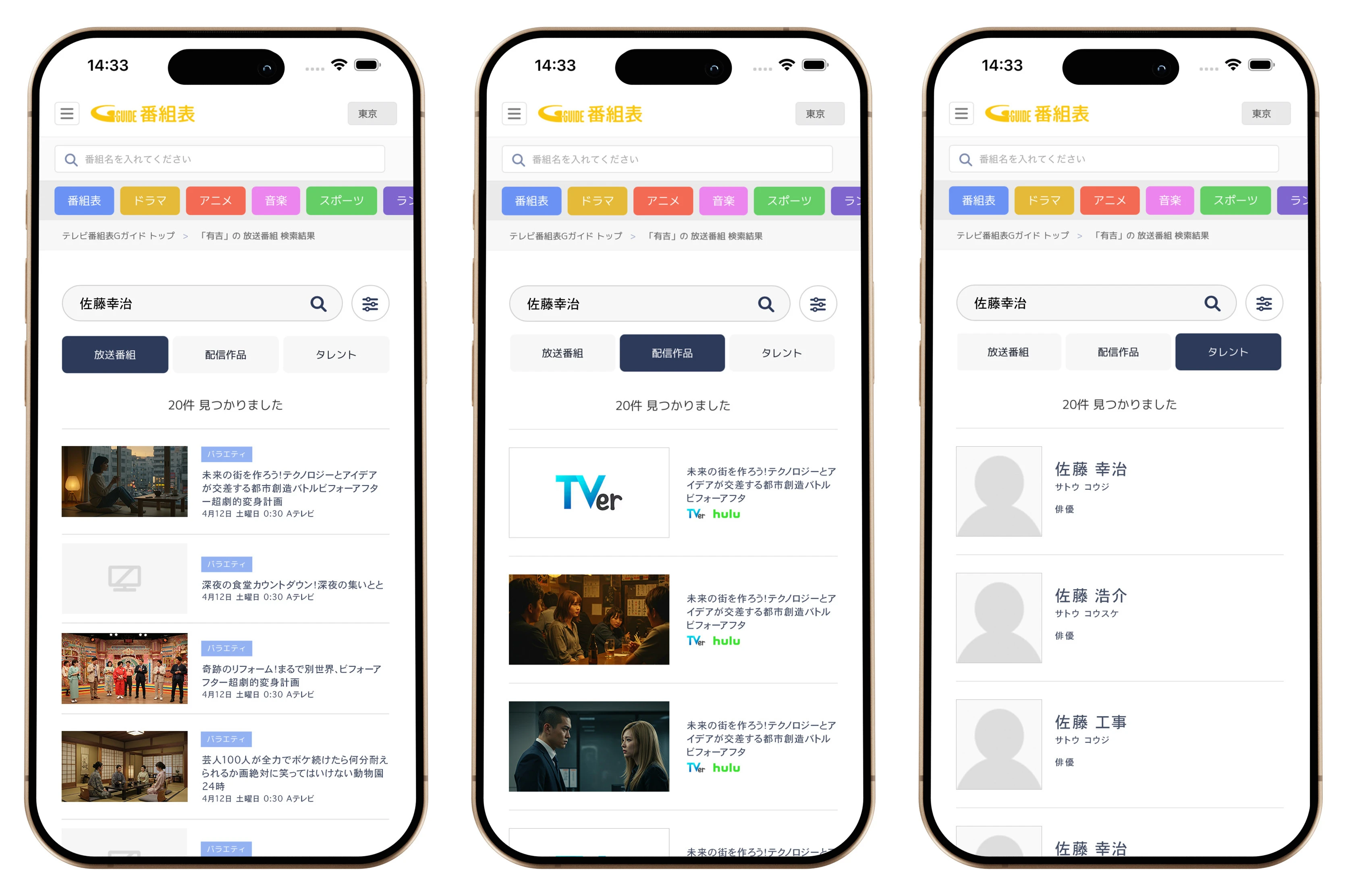 これにより、一度のキーワード検索で「放送番組」「タレント」さらに新たに追加した「配信作品」の検索結果をタブを切り替えながら表示できます。